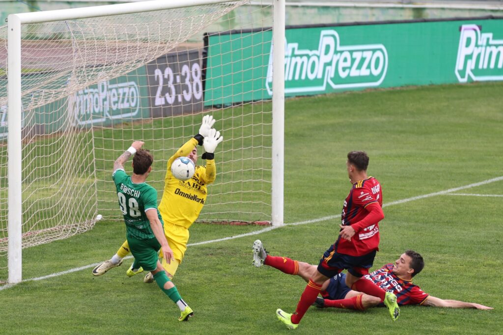 Il Monopoli non va oltre il pareggio a reti bianche in casa contro il Potenza e porta a tre le lunghezze sul Crotone che lo insidia per il terzo posto in classifica. In un pomeriggio dal clima decisamente invernale con pioggia, vento e freddo è mancato il coraggio ai padroni di casa che avrebbero potuto ipotecare la terza posizione senza aspettare gli ultimi due turni della regular season. Il Potenza mai ha fatto correre pericoli alla porta di Vitale accontentandosi di uscire imbattuto dal Veneziani. Di fronte a questo atteggiamento la compagine biancoverde si è quasi adagiata. Nè i cambi effettuati dal tecnico Colombo, alcuni dei quali anche tardivi (al 30’ della ripresa Yeboah per Bruschi e Battocchio per De Risio e al 41’ della ripresa la doppia sostituzione di Scipioni per Falzerano e Pellegrini per Grandolfo) hanno sortito effetti diversi. Al di là di tutto, più degli ospiti è stato il Monopoli ad andare più vicino al gol. L’azione più pericolosa al 24’ della ripresa quando Grandolfo ha messo sui piedi di Bruschi un invitante pallone che l’attaccante ha prima stoppato e poi mandato sopra la traversa a due passi dalla porta mancando incredibilmente un gol praticamente impossibile da sbagliare per un giocatore che ha tecnica da vendere (nella foto SS Monopoli il grave errore dell’attaccante biancoverde). L’azione appena descritta è stata l’unica della ripresa. Nel primo tempo il Monopoli ci ha provato con Greco al 32’ il cui destro è stato respinto dal portiere Alastra, poi bravo a bloccare la ribattuta di Pace. Poi al 36’ con Bruschi con un tiro a giro finito fuori e stessa sorte ha avuto un bolide che Bruschi ha sganciato dai 25 metri con la palla che ha sfiorato l’incrocio dei pali. Il derby appulo-lucano sta tutto qui ed è francamente poco. (Nardo Stama)